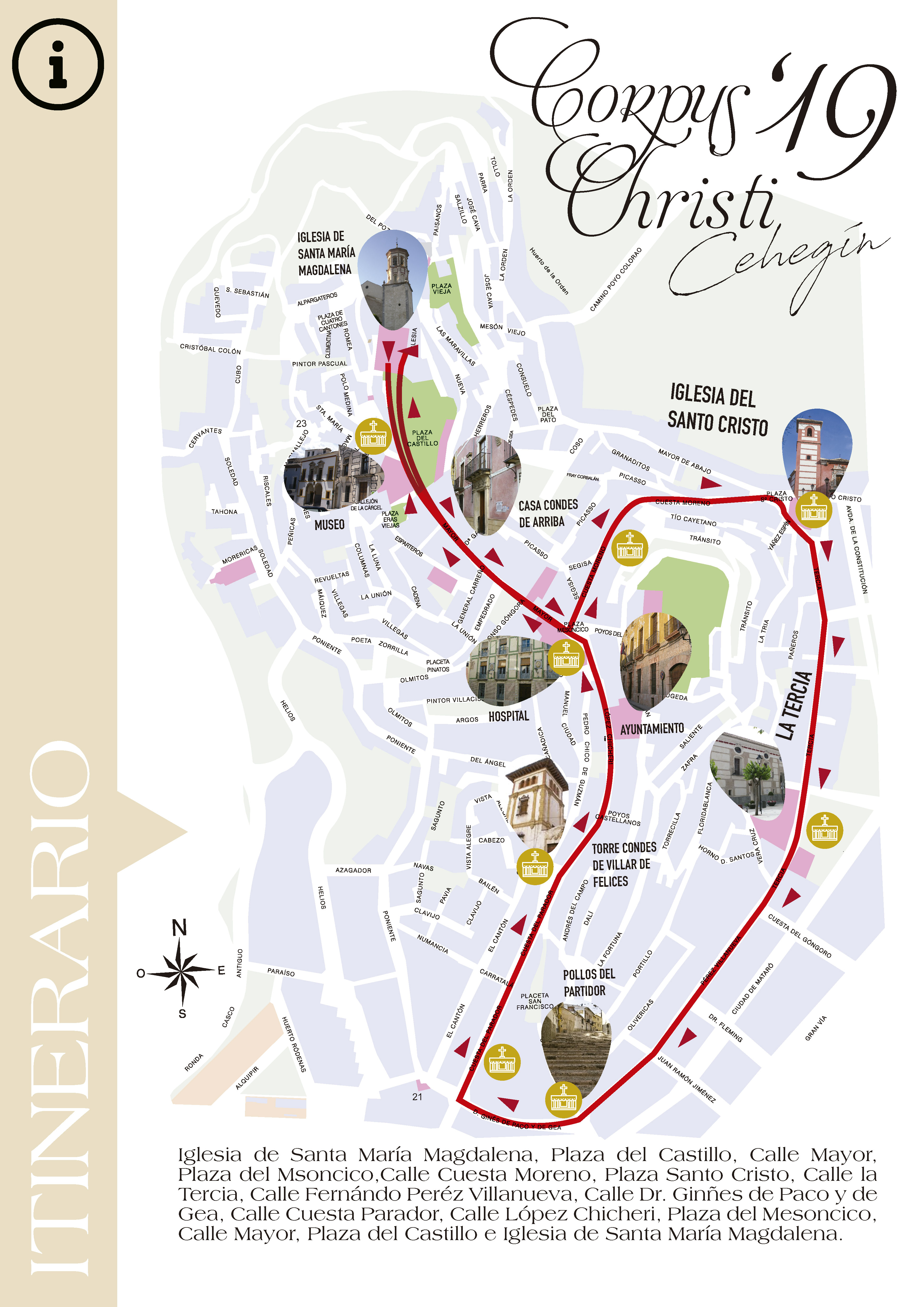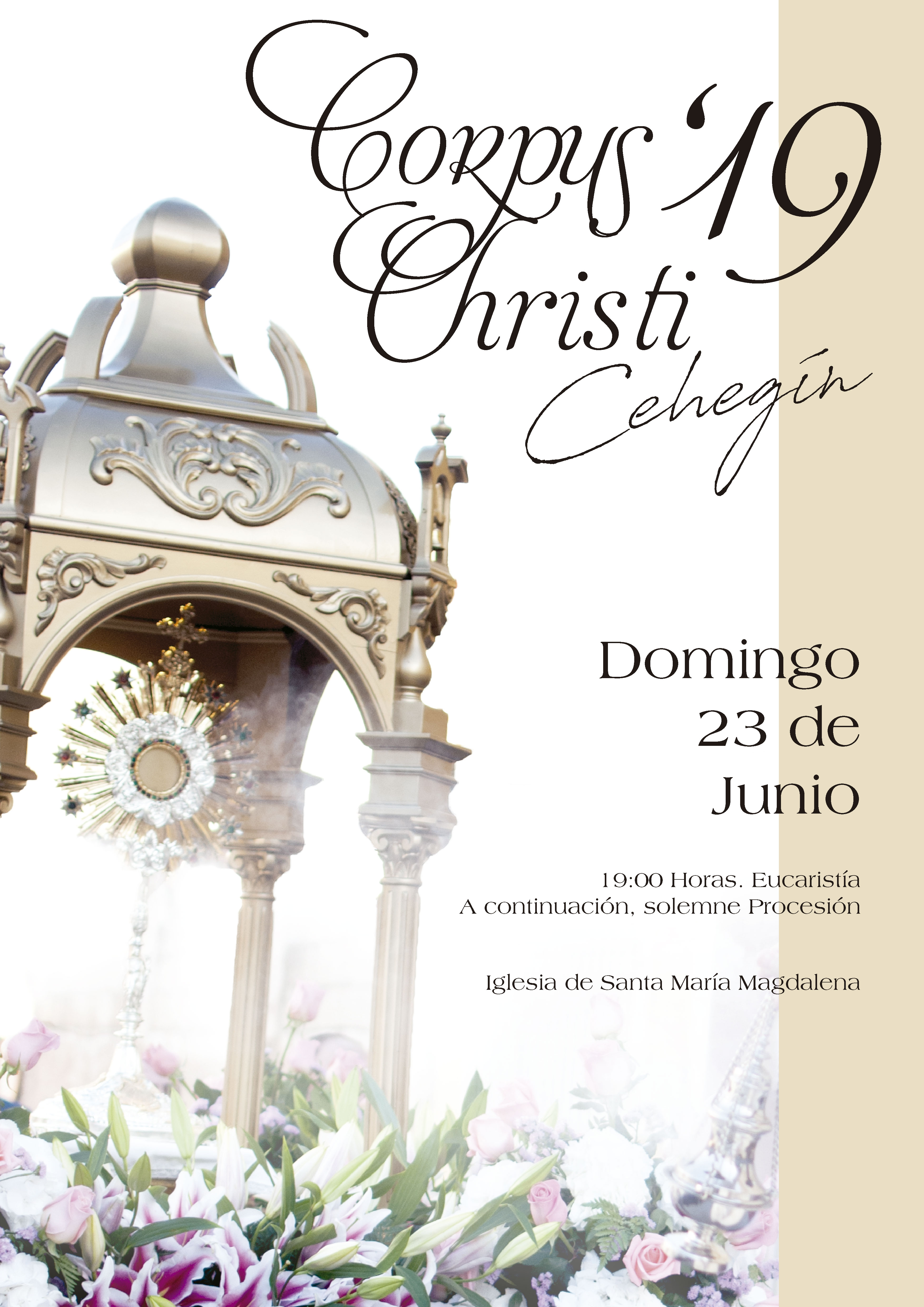 La Solemnidad del Corpus Christi se celebrará este domingo 23 de junio en la Iglesia de Santa María Magdalena; la procesión recorrerá las Calles del Casco Antiguo de Cehegín, conmemorando así el cuerpo y la Sangre de Cristo. Organizada por las tres Parroquias de Cehegín, junto a la coordinación de la Junta Central de Cofradías de Semana Santa, Hermandad de la Virgen de las Maravillas, Asociaciones del Fieles del municipio y Caritas Parroquial.